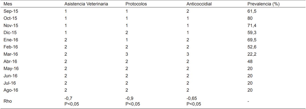 En la TABLA I se muestran los datos recogidos de la encuesta aplicada (asistencia veterinaria, protocolos de lavado y desinfección, tratamientos anticoccidiales). Esta información se analizó mediante una prueba de correlación con rangos de Spearman, y se determinó correlación negativa estadísticamente significativa (rho = - 0,9; P < 0,05) entre la prevalencia y los protocolos de desinfección, lo que indica que la prevalencia disminuye en la medida que se aplica el protocolo N° 3 (lavado + hidrojet + desinfección). Igualmente, se determinó correlación negativa estadísticamente significativa (rho = - 0,65; P < 0,05) entre prevalencia y empleo de Baycox al 5%, lo que sugiere que la prevalencia disminuye cuando se emplea este fármaco. Con respecto a la asistencia veterinaria, se encontró correlación negativa estadísticamente significativa (rho = - 0,7; P < 0,05), lo que sugiere que la prevalencia tiende a disminuir con la presencia del Veterinario en la granja.