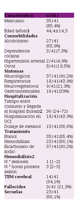 En el periodo de estudio se evaluaron 41 historias clínicas de pacientes con diagnóstico de intoxicación con metanol que ingresaron por emergencia, la mayoría fueron varones, con una media de edad de 44,4 ± 14,3 años. El 100% de los pacientes reportaron haber consumido alcohol en reuniones sociales sin saber sobre la posibilidad que sea metanol. Los síntomas neurológicos y respiratorios fueron la principal manifestación (37/41 y 18/41, respectivamente). El tiempo entre el consumo de alcohol y la llegada a emergencia del hospital fue de 48 h RIQ [24-72]. Recibieron terapia de hemodiálisis dentro de las primeras 24 h, 23/41 pacientes en la modalidad de hemodiálisis intermitente (Tabla 1).