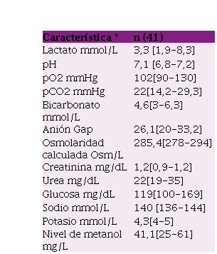 Así mismo, se evaluaron variables de laboratorio como nivel de lactato (mmol/L), pH, pO2 mmol/L, pCO2 mmol/L, bicarbonato mmol/L, anión gap, osmolaridad calculada (Osm/L), creatinina (mg/dl), urea (mg/dl), glucosa (mg/dl), sodio (mmol/L), potasio (mmol/L) y metanol (mg/L).