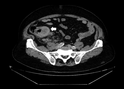 Por razones extramédicas el Servicio de Gastroenterología vuelve a atender al paciente el 21.12.23 y le programa colonoscopia (13.03.23), con el siguiente informe: posición: decúbito lateral izquierdo. Inspección: no se evidencian lesiones. Tacto rectal: esfínter normotónico, ausencia de tumoraciones palpables, ausencia de coccigodinia, dedo en guante limpio. Instrumentación: se ingresa hasta zona cecoascendente. No se puede avanzar por tumoración gigante que ocupa un 90% de la luz que se proyecta desde ciego hacia colon ascendente y que retrae de manera excéntrica zona cecal que impide acomodar colonoscopio para optima toma de biopsia. Conclusión: tumoración ulcerada infiltrante que compromete ciego y colon ascendente. El resultado histopatológico fue el siguiente: muestra constituida por tejido ulcerado, con material fibrinoleucocitario y escasas células atípicas. Estudio de inmunohistoquímica no contributorio (Figura 2).