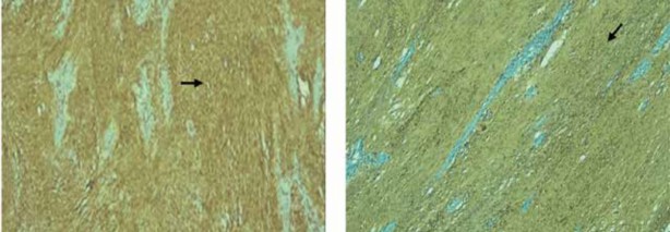 Estudio de inmunohistoquímica: vimentina (+); S100: positivo difuso; CD 117: negativo; actina: negativo; desmina: negativo; GFAP: positivo focal; HMB45: negativo; Ki67: 1% (Figuras 5 y 6). El perfil de inmunohistoquímica favorece el diagnóstico de schwannoma.