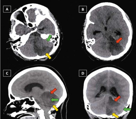Dos días después de su ingreso, experimentó deterioro clínico (ECG 3 ptos.), dilatación pupilar con hiporreactividad a la luz, ausencia parcial de reflejos troncales y falta de respuesta al estímulo nociceptivo. Las imágenes de tomografía espinal multicorte sin contraste (TEM s/c) del encéfalo evidenciaron isquemia del hemisferio cerebeloso izquierdo (correspondiente a los territorios de ACS y ACPI izquierdas) asociada a edema difuso del encéfalo (Figuras 1 y 2).