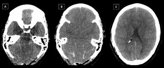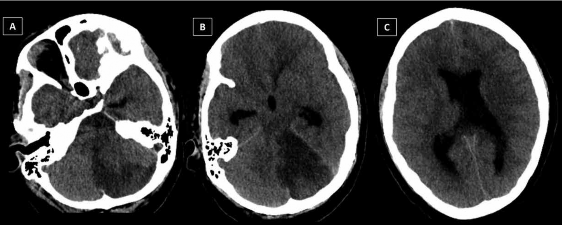 Cumplidas las 24 h posquirúrgicas y, a pesar del manejo neurointensivo, se produjo el deterioro neurológico brusco y gradual de la paciente. Las imágenes de TEM s/c control del encéfalo revelaron edema intenso y difuso, isquemia y hemorragia subaracnoidea (Figura 3). Clínicamente, se evidenció bradicardia, hipertensión arterial, pupilas midriáticas arreactivas, ECG 3 ptos. y ausencia completa de reflejos troncales. La paciente presentó fallo multiorgánico, inestabilidad hemodinámica y muerte.