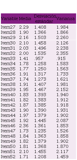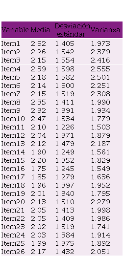 La validez de constructo y la capacidad discriminante del instrumento, se evaluó a través de la varianza, arrojando varianzas en el intervalo de 1,459 y 2,355 (Tabla 1). La correlación de Person entre ítems y la correlación total fue positiva. Los ítems con mayor aporte a la sumatoria son los ítems 16, 34, 41 y 47. Ningún ítem tiene valor negativo o de cero. Pese a que el instrumento está agrupado en dimensiones, se realizó el análisis factorial confirmatorio (AFC) con el método Varimax, para asentir desde el punto probabilístico, que los ítems