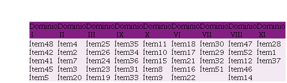 planteados para dichas dimensiones realmente pertenecen a ese dominio. Al realizar el método Varimax se reafirmó que los ítems realmente pertenecen a ese dominio. Solo un ítem por dominio en promedio, arrojó que no pertenecía a ese dominio, el dominio IX en su totalidad fue distinto al ya creado. El orden probabilístico de los dominios si fue distinto al ya establecido (Tabla 2). La última parte de la validez interna es la fiabilidad del instrumento, la cual se calculó a través del coeficiente Alfa de Cronbach, obteniendo un índice de 0,965, demostrando que el instrumento hace mediciones consistentes.