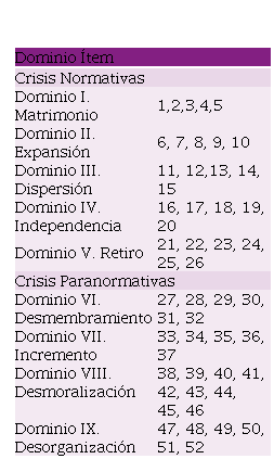 Tras una búsqueda amplia de información en la literatura existente, se corroboró que el concepto está parcialmente definido, por lo que se exploró el concepto a través de expertos en crisis familiares por medio de una entrevista a profundidad. La entrevista permitió encontrar un gran número de características acerca de las crisis familiares. Se enlistó 100 palabras clave sobre el tema de crisis familiares, que se complementaron con la información encontrada en la revisión de la literatura. Al tener el listado de palabras, se agrupó los conceptos, con la finalidad de resumir el número de éstas, se fueron eliminado las que estaban duplicadas o estaban incluidas dentro de otras; de esta manera se redujo el número de palabras y se procedió a la redacción de los primeros 50 ítems (favorables y desfavorables). Se construyó inicialmente una escala con 9 dominios, 5 dominios que evalúan crisis normativas y 4 que evalúan crisis paranormativas conformados por 50 ítems y sus alternativas de posibles respuestas de carácter ordinal.