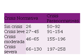 Para el puntaje otorgado a las respuestas, se utilizó una escala tipo Likert de frecuencia, la ponderación se asignó de manera distinta a las crisis normativas y crisis paranormativas. A las crisis normativas se asignó el siguiente puntaje según la respuesta: Nunca = 1, casi nunca = 2, pocas veces = 3, casi siempre = 4 y siempre = 5. En base al puntaje total se clasificó en: Crisis severa = 105-130, crisis moderada = 79-104, crisis leve = 27-78 y sin crisis ≤ 26. Las crisis paranormativas, se categorizaron para otorgar una ponderación elevada a la más grave y de ahí en orden descendente asignar un puntaje. Se recodificaron los puntajes en 3 ocasiones, asignando finalmente un puntaje de 12 a los ítems 27, 31, 32, 45 y 51; puntaje de 11 a los ítems 28, 30, 40, 43 y 48; puntaje de 10 a los ítems 29, 38, 39, 41 y 49; puntaje de 9 a los ítems 34, 42, 46, 50 y 52 y puntaje de 8 a los ítems 33, 35, 36, 37, 44 y 47. La codificación para cada ítem y respuesta se muestra en el cuadro 7. En base al puntaje total se clasificó en: Crisis severa = 197-258, crisis moderada = 155-196, crisis leve = 51-154 y sin crisis