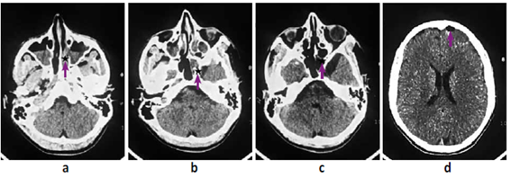 Es evacuado a nuestro nosocomio donde se realiza una tomografía (TEM) cerebral sin contraste (figura N° 1 y N° 2) evidenciando fractura de hueso etmoidal, cigomático izquierdo e imagen isodensa biconcava anivel de espacio epidural frontal izquierdo con efecto de masa, hemograma con leucocitosis 14,000 leu/mm3 y proteína C reactiva 45mg/dl.