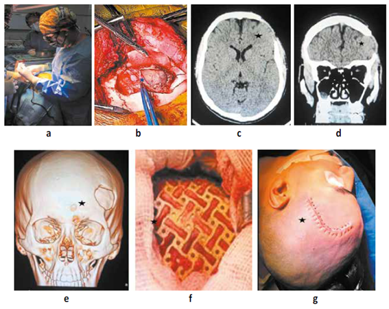 a. Paciente en decúbito dorsal con cabecera girada hacia lado contralateral. b. Craniectomía que evidencia colección purulenta en espacio epidural e infiltración de duramadre que se irradia hacia base de cráneo (). c y d. TEM cerebral control se evidencia cambios postquirúrgicos no presencia de colección yuxtadural (). e. Reconstrucción 3D de calota craneana que muestra el defecto craneal (). f. Craneoplastía conmalla de titanio ( ). g. Se evidencia herida posoperatoria inmediata, adecuadamente afrontada ().