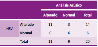Se enrolaron 20 personas. En el PRAAT se encontró que el promedio de la frecuencia fundamental (F0) de la población masculina fue de 111, con Jitter de 0,01, Shimmer de 0,62 y HNR de 15, mientras que el promedio de la F0 de la población femenina fue de 179, con Jitter de 0.11, Shimmer de 0.19 y HNR de 14. En la Video-LAV se encontró que la fase del cierre fue anormal en 5 % de los participantes, la amplitud fue anormal en 30 %, la onda mucosa fue anormal en 0 %, la simetría de fase fue anormal en 15 %, la periodicidad fue anormal en un 10 %, la actividad supraglótica fue anormal en un 55 %, y el borde libre fue normal en todos los participantes. Utilizando la prueba de Chi cuadrado, se encontró una asociación significativa entre el grado de análisis acústico alterado y las alteraciones en la Video-LAV (p<0,012). Ver Tabla.