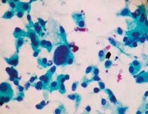 El diagnóstico parte de la evaluación minuciosa, antecedentes, examen físico, nivel de TSH sérica y ecografía de tiroides y cuello. Este se confirma con una biopsia por aspiración con aguja fina, si el nivel de TSH en suero está dentro del rango de referencia o elevado o si las imágenes con yodo radioactivo muestran un nódulo hipofuncionante [6,9]. El examen citológico se realiza por aspiración con aguja fina para determinar si la lesión es maligna y determinar el subtipo histológico. Aquí entra a tallar el papel indispensable del médico patólogo y su experiencia para la identificación correcta. Esto se da sobre todo cuando se enfrentan a situaciones histopatológicas mixtas, ya que influyen directamente en el pronóstico, planes de tratamiento y vigilancia a largo plazo.