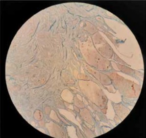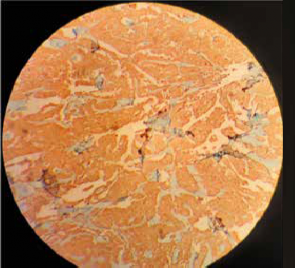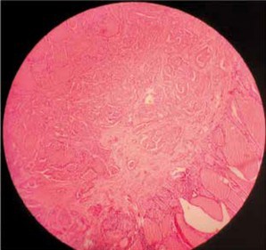 · Lóbulo derecho de glándula tiroides: carcinoma medular de tiroides, unifocal, tamaño tumoral: 2,2 cm. Márgenes: el carcinoma invasivo a menos de 1 mm de la superficie glandular. Angioinvasión, invasión linfática y perineural: negativo. Índice mitótico: 2 mitosis/10 cga. Extensión extratiroidal: negativo. Inmunohistoquímica: calcitonina: (+); tiroglobulina: (-); cronogranina: (+); sinaptofisina: (+); (Figuras 2a y 2b).