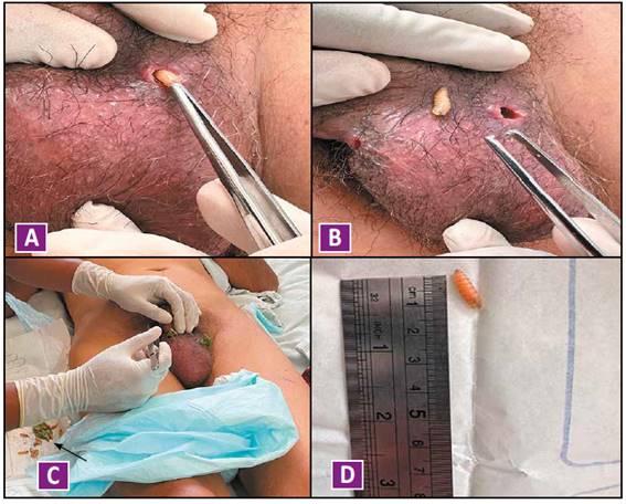 En nuestro caso, la presentación fue clásica, con pequeños orificios por los cuales se observaba secreción serohemática y la presencia de puntos blancos móviles. La particularidad de esta miasis escrotal radica en que se identificaron tres áreas diferentes comprometidas y se extrajeron múltiples larvas, en total una veintena, lo cual es una situación infrecuente según la escasa literatura sobre miasis cutánea en esta localización.