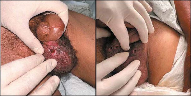 Aparato genito-urinario: Pene con prepucio levemente edematizado en la región dorsal. En la bolsa escrotal se aprecian dos orificios en el lado derecho y uno en el lado izquierdo, todos con un diámetro aproximado de 0,5 cm y una profundidad de hasta 0,5 cm, con presencia de secreción clara y elementos móviles tipo larvas, junto con eritema perilesional leve (Figura 1). Linfáticos: Adenopatías pequeñas, múltiples, móviles e indoloras en ambas regiones inguinales. Resto del examen clínico sin evidencia de alteraciones.