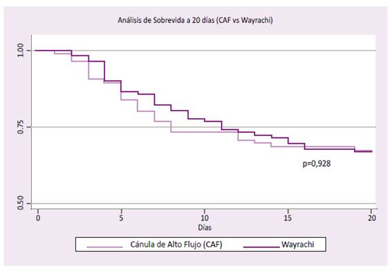 De los 114 pacientes ventilados con Wayrachi, fallecieron 39 (34,2 %) y de los 88 pacientes que fueron tratados con Cánula de Alto Flujo comercial (CAF), fallecieron 30 (34,1 %). Al realizar el análisis de supervivencia no se consideraron a 4 participantes ya que estos fallecieron al mismo día de ingreso. De estos 2 usaron Wayrachi y 2 CAF. Se observó un 65,8 % de sobrevida a los 20 días para todos los participantes. Al evaluar el porcentaje de sobrevida entre Wayrachi y CAF no se encontró una diferencia significativa (65,8 % vs. 65,9 %, p=0,928) (Gráfico 1).
