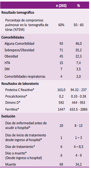 Se analizó la presencia de comorbilidades: antecedentes de hipertensión arterial, diabetes mellitus, comorbilidades respiratorias o la presencia de alguna otra comorbilidad pertinente, sobrepeso (IMC mayor o igual a 25) u obesidad (IMC mayor o igual a 30). Así mismo, se incluyeron los resultados de pruebas de laboratorio (Dímero-D, procalcitonina, ferritina y Proteína C Reactiva) e imágenes pulmonares (Porcentaje de compromiso pulmonar en la tomografía de tórax -%TEM-) al ingreso.