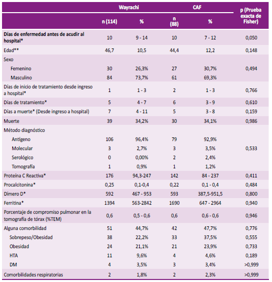 Al realizar la comparación entre el uso de Wayrachi y la CAF se observó que no se presentaron diferencias significativas entre dichos grupos tanto para variables sociodemográficas como en su evaluación y evolución. A pesar de esto la variable “días de enfermedad antes de acudir al hospital” presentó valores menores casi significativos para el grupo de CAF (Tabla 4).
