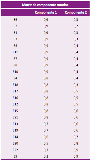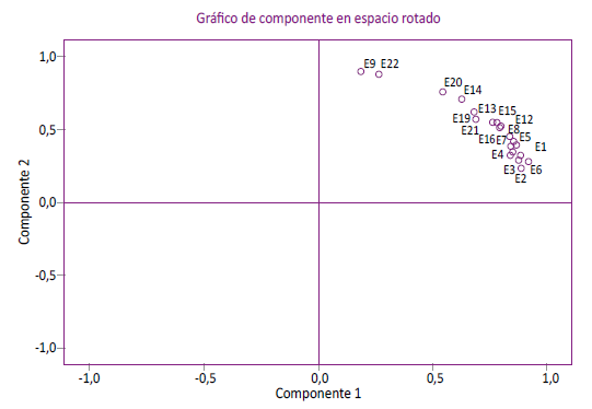 Se identifican dos factores relevantes del presente cuestionario: Primer factor: ítems E6, E2, E3, E1 que tienen coeficientes factoriales elevados en la primera componente y se resume como “Desarrollo del taller”. Segundo factor: ítems E14, E20, E22, E9 que tienen coeficientes factoriales elevados en el segundo componente y se resume como “Empatía y Elementos tangibles”.