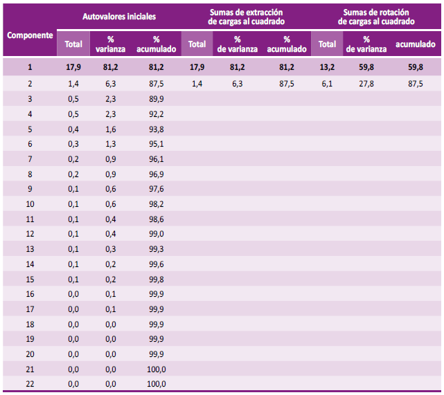 La obtención de los valores comunes se determinó mediante el método de componentes principales y la rotación ortogonal usada fue Varimax, con normalización de Kaiser con la finalidad de interpretar mejor los factores obtenidos (Tabla 1). La validez de constructo del cuestionario de satisfacción por este método permitió identificar factores con 87.5 % de variabilidad total, lo cual indica alta validez de constructo (máximo 100 %) (Tabla 2).