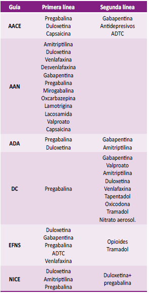 Existen 6 asociaciones que brindan recomendaciones para el tratamiento farmacológico de la neuropatía. La “National Institute for Health and Care Excellence” (NICE) y “European Federation of Neurological Societies” (EFNS) manejan recomendaciones para polineuropatía dolorosa de cualquier causa [27,28]. La “American Diabetes Association” (ADA), “American Association of Clinical Endocrinologists” (AACE), la “American Academy of Neurology” (AAN) y Diabetes Canada (DC) recomiendan específicamente para ND dolorosa (20,29-31). El consenso general es el uso de antidepresivos tricíclicos (ADTC), inhibidores de recaptura de serotonina y noradrenalina (ISRSN) y gabapentinoides como primera y segunda línea, ya que su eficacia es similar. El único medicamento en el que las 6 guías clínicas concuerdan para el tratamiento de primera línea para ND es la pregabalina. En cuanto a la “Food and Drug Administration” (FDA), los ATDC se encuentran “off-label”. Tabla 2.