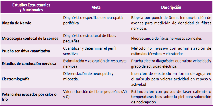 Las pruebas confirmatorias se utilizan en el ámbito de la investigación o en presentaciones atípicas de la enfermedad. Se pueden dividir en estructurales y funcionales, y no modifican el tratamiento ofrecido ni se correlacionan con la severidad del dolor o sintomatología. Las velocidades de conducción nerviosa y electromiografía son las más accesibles, pero como se ha mencionado tienen una utilidad limitada. Los estudios de conducción nerviosa demuestran disminución de la amplitud del potencial de acción sensitivo, con leve disminución en la velocidad de conducción. La electromiografía puede diferenciar entre una miopatía o neuropatía [24]. El resto de los estudios se describen en la Tabla 1.