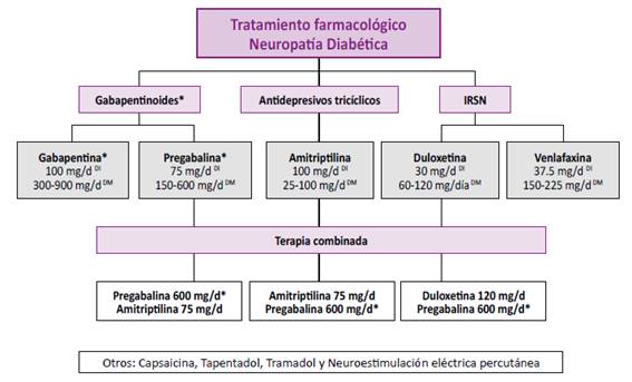 La terapia combinada de dosis estándares puede ser una opción en pacientes que no responden a la monoterapia; sin embargo, hay que valorar los efectos adversos. En el estudio COMBO-DN, se demostró una reducción de >50 % de dolor en 52.1 % del grupo combinado y 39.3 % de monoterapia alta dosis. Además, hubo una buena tolerancia a la combinación de duloxetina 60 mg y pregabalina 300 mg [41]. En el ensayo clínico de OPTION DM, se evaluaron las combinaciones de amitriptilina-pregabalina, pregabalina-amitriptilina y duloxetina-pregabalina, donde se inició con monoterapia y en no respondendores se agregó un segundo medicamento, los tres regímenes disminuyeron el dolor de forma significativa y fueron superiores a la monoterapia. Los efectos adversos dependieron de cada tratamiento [42].