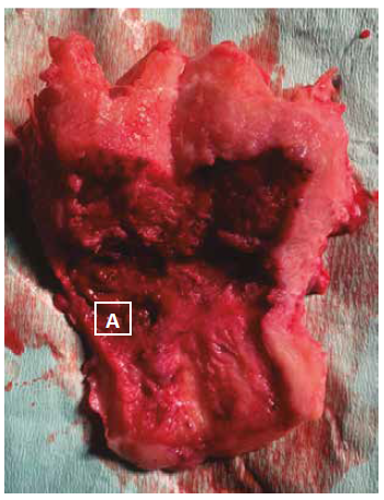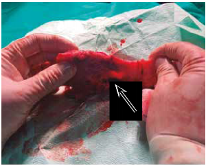Tras consenso con la paciente posterior a la impresión diagnóstica ecográfica, se decidió realizar una evaluación bajo anestesia más una aspiración manual endo-uterina (AMEU) y un legrado uterino (LU). Durante el procedimiento en el intraoperatorio; se evidenció saco gestacional colapsado en canal cervical, y a pesar del LU se encontró un sangrado activo, no controlable y la paciente entró en inestabilidad hemodinámica, por lo que se decidió la conversión de operación a una histerectomía abdominal total y la transfusión de 2 paquetes globulares (Fig. 2 y 3).