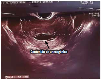 Al examen físico se encontró a la paciente lúcida y orientada en las 3 esferas, hemodinámicamente estable, en el abdomen se auscultaron ruidos hidroaéreos presentes, sin signos peritoneales, ni visceromegalias. El examen ginecológico mostró un útero en ante versión y ante flexión de aproximadamente 10 cm con metrorragia moderada; cérvix entreabierto, posterior, no doloroso a la movilización de cérvix y anexos. En la ecografía se encontró un útero en anteversoflexión de 95.4 mm x 53.8 mm x 64.3 mm, con presencia de coágulos en cavidad uterina, sin evidenciarse saco gestacional, por lo que se concluyó como impresión diagnóstica de Aborto Incompleto (Fig. 1).