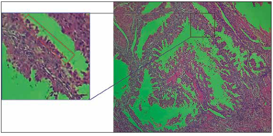 El estudio de anatomía patológica confirmó el diagnóstico de embarazo ectópico mediante la identificación de tejido trofoblástico hemorrágico en la pieza operatoria, en el cual se describe una base de tejido conectivo y músculo liso en el cual se proyectan estructuras de crecimiento digitiforme con revestimiento epitelial sin un núcleo fibrovascular distinguible, conformado por células agrandadas de formas poliédricas con abundante citoplasma eosinofílico con grandes núcleos hipercromáticos, pleomórficos, compatible con Reacción de Arias-Stella (Figura 4).