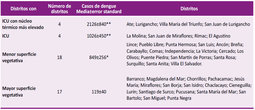 Datos obtenidos de dos fuentes: Soberón VS, Obregón E. Identificación de Islas de Calor en la ciudad de Lima Metropolitana utilizando imágenes del Satélite Landsat 5TM. Lima: ResearchGate. 2015; y de Sistema Metropolitano de Información Ambiental. Islas de Calor en Lima y acciones para enfrentar las altas temperaturas de la ciudad. Municipalidad de Lima. 2021. Y de la información de la Sala Situacional Diaria del Dengue de la CDC del Ministerio de Salud al 8 de agosto de 2023.