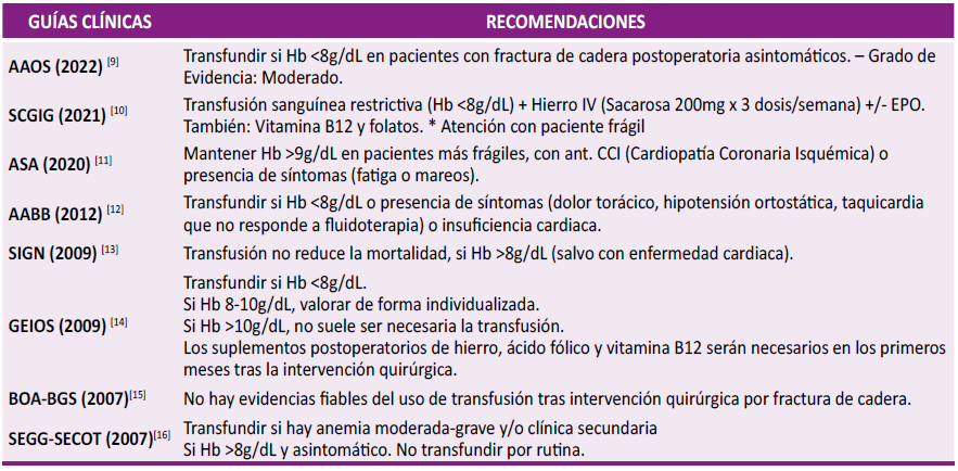 En el 2021, el Consenso Inter-Societario sobre Fractura de Cadera en el Adulto Mayor (CISFraCAM) indicó que se debe “Evaluar al paciente, y buscar factores de riesgo de sangrado y posible terapia transfusional”. [8] Además, los pacientes con riesgo de sangrado operatorio deben ser evaluados en busca de anemia prequirúrgica (Nivel de evidencia 1C).[8] Al respecto, hemos considerado útil para el lector clínico, resumir las recomendaciones para la transfusión de sangre en adultos mayores según las guías clínicas disponibles, las cuales se presentan en orden cronológico en la Tabla adjunta.