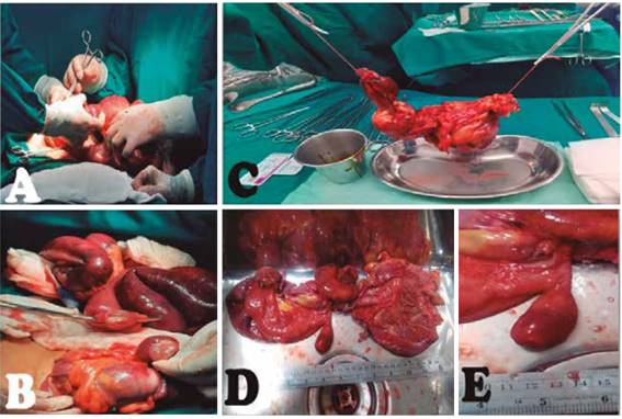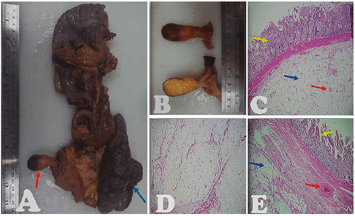 A su ingreso por emergencia, se encontró estable del punto de vista hemodinámico, al examen físico un abdomen distendido, timpánico, doloroso en hemiabdomen derecho, a predominio de FID, y ruidos hidroaéreos con timbre metálico en hemiabdomen izquierdo. Ingresa a sala de operaciones con el diagnóstico de obstrucción intestinal, por bridas y adherencias. Se realiza una laparotomía exploratoria que evidencia líquido inflamatorio, asas delgadas dilatadas; y una intususcepción intestinal que compromete aproximadamente 20cm del íleon terminal, ciego y colon ascendente, con isquemia y edema de asas intestinales (Figura 1) Por lo que se realiza resección intestinal de los segmentos comprometidos, e ileostomía terminal. Paciente cursa con buena evolución clínica y es dado de alta a los 7 días. El estudio histopatológico informó una intususcepción íleo-ileal secundaria a angiolipoma submucoso pedunculado de íleon (Figura 2). Paciente reingresa al mes de la primera cirugía, y se le realiza una restitución del tránsito intestinal con una anastomosis íleo transversa. Paciente cursa con buena evolución posoperatoria y es dado de alta a los 12 días, sin complicaciones.