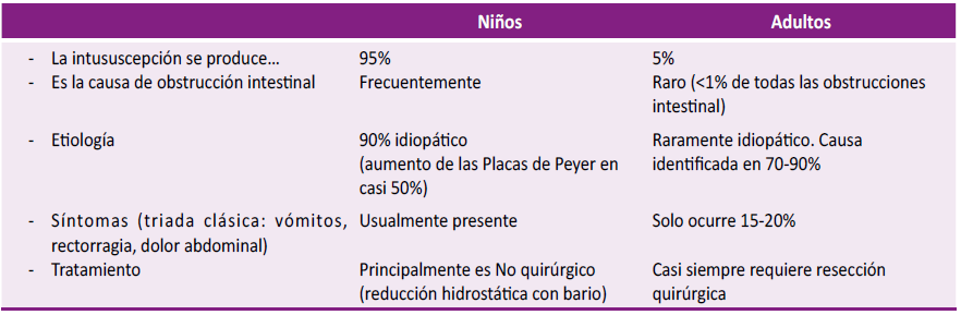 Las manifestaciones clínicas de las intususcepciones en adultos difiere de la de los niños en varios aspectos (Tabla 1).[9] La tríada pediátrica típica, dolor abdominal, masa abdominal palpable y heces con sangre, rara vez se observa(2). Los síntomas pueden ser agudos (<7 días), subagudos (7 días-3 meses) o crónicos. [10,11] La presentación en pacientes adultos con intususcepciones son inespecíficos y, a menudo de larga data[9], similares a una obstrucción intestinal.[4,10] Además, la duración de los síntomas puede ser mayor en pacientes con lesiones benignas y entéricas en comparación con aquellos con lesiones malignas y colónicas.[9]