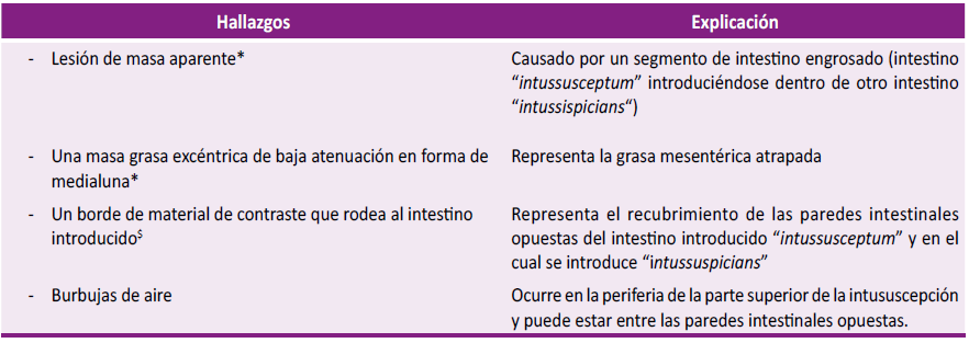 Varios métodos pueden contribuir al diagnóstico preoperatorio como TC, ecografía abdominal, radiografía simple, angiografía y estudios con radio nucleótidos. [2,6] La TC parece ser la prueba más fiable para hacer un diagnóstico preoperatorio (Tabla 2) [9],considerada el gold estándar [4,11], mostrando valores densitométricos grasos de –40 a –120 unidades Hounsfield (UH) y una apariencia uniforme con borde liso[7], con el signo típico de “diana”[2,7]; además, tiene la ventaja de revelar el sitio, el nivel y la causa de obstrucciones intestinales.[2] La ecografía es de ayuda, pero el valor diagnóstico del signo de “diana” o “pseudo riñón”, en ocasiones, disminuye por la presencia de demasiado aire intestinal, producto de la obstrucción intestinal. [1,10,11] La colonoscopia ayuda cuando los síntomas indican una obstrucción del intestino grueso, además ayuda en la identificación del punto de derivación y el diagnóstico patológico de la invaginación intestinal.[2] El enema de bario se usa a menudo para diagnosticar y tratar la invaginación intestinal; rara vez se realiza en adultos.[2]