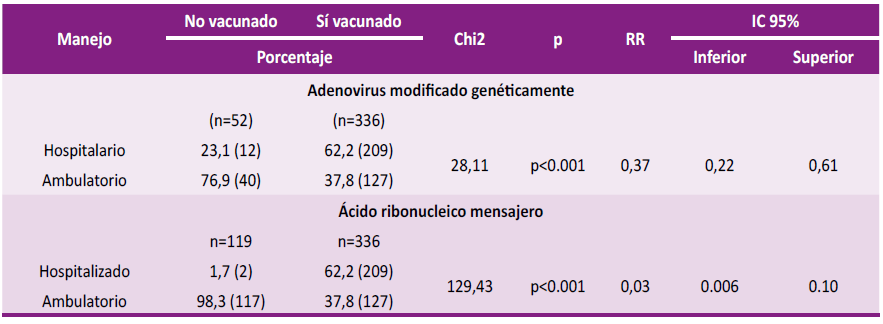 El manejo hospitalario en el grupo sin vacuna fue 62,2 %, en el grupo con vacuna de adenovirus modificado genéticamente 23,1 % (p<0.001) riesgo relativo=0,37 (IC 95%; 0,22-0,61) y en el grupo con vacuna de ácido ribonucleico mensajero 1,7 % (p<0.001), riesgo relativo=0,03 (IC 95%; 0,006-0,10). En el cuadro 2 se presenta el resto de la información.