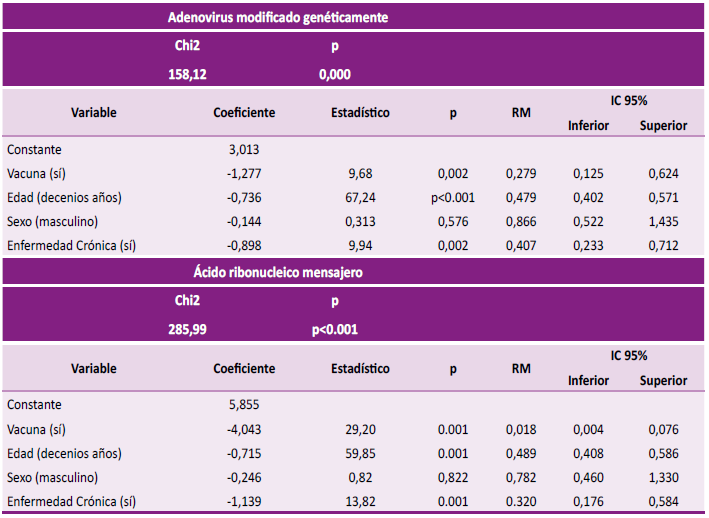 Para el análisis estadístico se trabajó al 95 % de confianza, se realizó de manera independiente para el grupo de vacuna (adenovirus modificado genéticamente y ácido ribonucleico mensajero), en ambos casos el grupo de comparación lo integraron los no vacunados. Se compararon datos descriptivos que incluyeron porcentajes y promedios; el análisis inferencial bivariado utilizó prueba de chi cuadrada, riesgo relativo e intervalo de confianza para riesgo relativo; el análisis multivariado se empleó para realizar proyecciones y se incluyó regresión logística múltiple y cálculo de la probabilidad de ocurrencia del evento.