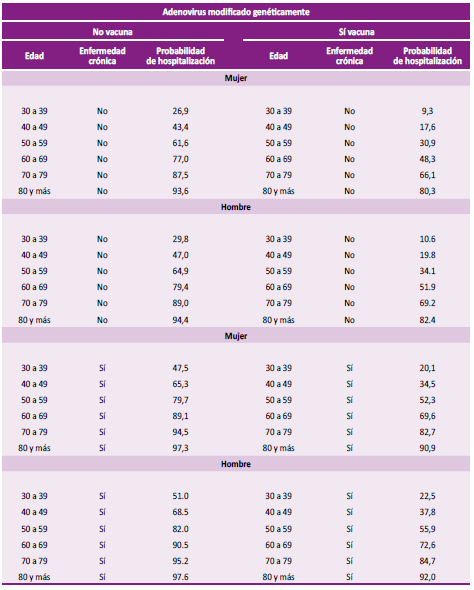 En una mujer entre 50 y 59 años que no tiene enfermedad crónica degenerativa y no recibió vacuna de adenovirus modificado genéticamente, la probabilidad de hospitalización si presenta COVID-19 es 61.6 %; si recibió vacuna la probabilidad de hospitalización es 30,9 %. En el cuadro 4 se presenta la probabilidad para los escenarios estudiados.