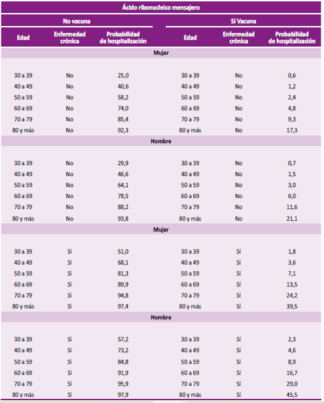 En un hombre entre 60 y 69 años que presenta enfermedad crónica y no recibió vacuna de ácido ribonucleico mensajero, la probabilidad de hospitalización es 91,9 %, si recibió vacuna, la probabilidad es 16,7 %. En el cuadro 5 se presentan las probabilidades para los escenarios propuestos.