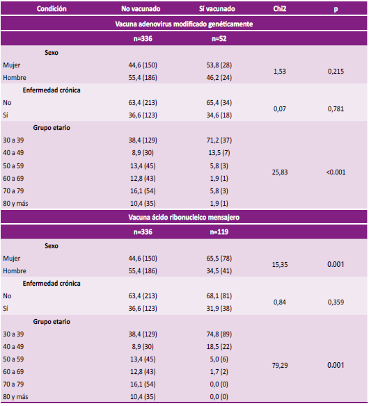 En pacientes con vacuna de adenovirus modificados genéticamente no existe diferencia entre los grupos vacunado y no vacunados en las variables sexo (p=0,215) y presencia de enfermedad crónica (p=0,871), en el grupo vacunado estadísticamente la edad es menor en relación al no vacunado (p=0,000). En pacientes con vacuna de ácido ribonucleico mensajero, existe diferencia estadísticamente significativa entre los grupos vacunado y no vacunado en las variables sexo (p<0.001) y edad (p<0.001), no existe diferencia en la variable enfermedad crónica (p=0,359) (Cuadro 1).