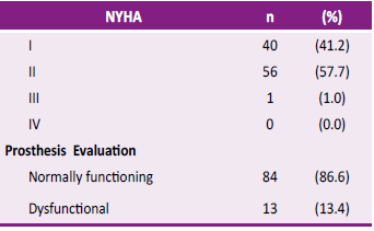 The mean study follow-up was 39.4 ± 20.2 months, with a median of 37 months. In the first-year follow-up, 11.8% of the cases (13/110) died, considered from the day of surgery, nine patients (8.2%) died of cardiovascular causes (four cases of cardiogenic shock, three of heart failure, one acute coronary syndrome and one case of stroke), three patients (2.7%) died from sepsis and one patient (0.9%) died from malignant neoplasm. Of the remains 97 patients who were evaluated in an outpatient clinic,41.2% were asymptomatic and 57.7% were classified as NYHA II. All patients had control echocardiography, finding prosthesis dysfunction in 13.4%, of which two cases were due to stenosis, nine due to paravalvular leak, and two cases due to both causes. (Table 4).