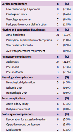 Within the post-surgical complications, reoperation was performed to review hemostasis due to excessive bleeding in 6 cases (5.5%), there were two cases of mediastinitis (1.8%). The most frequent cardiac complication was low cardiac output syndrome (7.3%), followed by cardiogenic shock and vasoplegic syndrome (6.4% each). The most frequent arrhythmia was atrial fibrillation (19.1%), one patient required permanent pacemaker implantation for treatment of third-degree atrioventricular block. The most frequent pulmonary complications were atelectasis (21.8%) and pneumonia (7.3%). Five patients presented neurological dysfunction (4.5%) and there were two cases of cerebrovascular disease (1.8%). Eight patients presented acute renal failure (7.3%), of which none required dialysis. Of the total number of operated patients, 20.9% did not present complications. (Table 3)