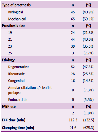 Conventional valve replacement surgery was performed in all patients through median sternotomy and extracorporeal circulation. 59.1% were mechanical valves and 40.9% bioprosthetic valves, suture less prosthesis was not used. The most frequent prosthesis sizes were N° 21 and 23 (40% and 35.5%, respectively). The most frequent etiologies were degenerative (47.3%), rheumatic (25.5%), congenital bicuspid