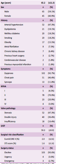 A total of 110 patients were part of this study, the mean age was 65.2 ± 11.3 years, 59.1% were male. The most frequent pathological antecedents were arterial hypertension (47.3%), dyslipidemia (19.1%), diabetes mellitus and smoking (18.2% each). All patients were symptomatic, with dyspnea being the most frequent manifestation (92.7%), followed by chest pain (46.4%). The most frequent functional class of admission was NYHA II (70.9%), followed by NYHA III (20.9%). The mean left ventricular ejection fraction was 59.3 ± 9.9%. The mean of the