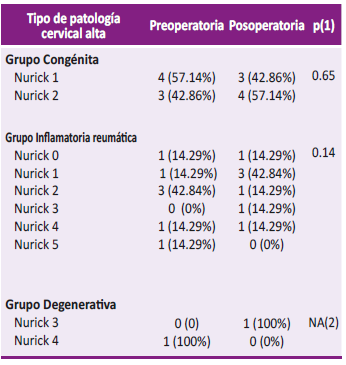 Para la evaluación de mielopatía cervical se utilizó los grados de Nurick que puntúa del 0 al 5, en el cual el grado 0 sólo presenta radiculopatía, grado 1 fue mielopatía pero puede deambular, grado 2 fue mielopatía pero deambula con dificultad, grado 3 fue mielopatía pero deambula con dificultad y limita su trabajo, grado 4 fue deambula sólo con apoyo y grado 5 fue paciente postrado. Esta variable se evaluó en los pacientes con patología cervical alta congénita e inflamatoria reumática, en el preoperatorio y el posoperatorio.