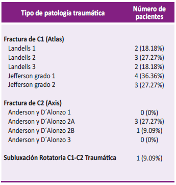 Como se menciona en la literatura, las fracturas del atlas y de la apófisis odontoides son las patologías más frecuentes en el grupo traumático, como se logra evidenciar en nuestro estudio, que llega a tener 7 fracturas de C1 y 4 fracturas de apófisis odontoides, y como se ha descrito, esta patología se trata con fijación C1-C2 o en casos seleccionados con tornillo transodontoideo anterior, tal como hemos encontrado en nuestro estudio que se realizaron 9 fijaciones cervicales altas y 2 tornillos transodontoideos.