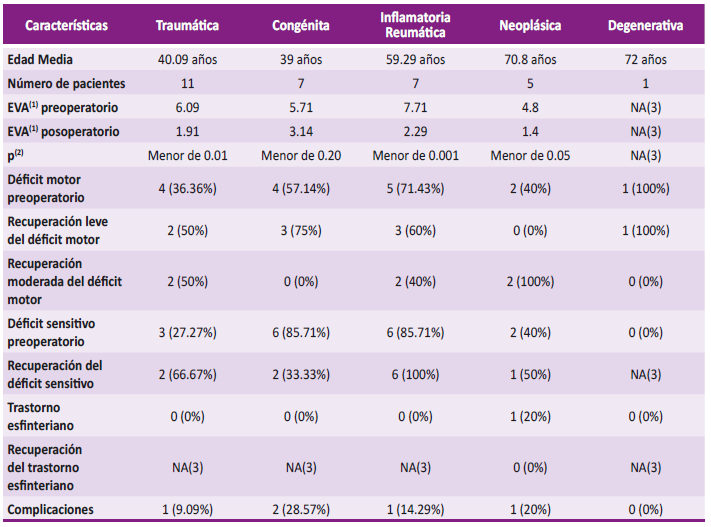 En el grupo inflamatoria reumática se obtuvo 7 pacientes, que tenía una edad promedio de 59.29 años, con antecedente de artritis reumatoidea en todos los pacientes, además de tener el antecedente de osteoporosis en 6 pacientes (85.71%) y de hipertensión arterial en 4 pacientes (57.14%). El EVA preoperatorio promedio fue de 7.71, mientras que el EVA posoperatorio promedio fue de 2.29, con diferencia estadísticamente significativa (p menor de 0.001). El Nurick preoperatorio más frecuente fue 2 en 3 pacientes (42.84%), mientras que el Nurick posoperatorio más frecuente fue 1 en 3 pacientes (42.84%), lo cual no tuvo diferencia estadísticamente significativa (p=0.14). El déficit motor preoperatorio se presentó en 5 pacientes (71.43%), recuperando todos los pacientes, teniendo una recuperación leve en 3 pacientes (60%) y recuperación moderada en 2 pacientes (40%). Se presentó déficit sensitivo en 6 pacientes (85.71%), con recuperación en todos ellos. Sobre las imágenes preoperatorias, no se pudo determinar el DOA y DOP en 3 pacientes, y en el resto de pacientes se logró identificar subluxación anterior en 2 pacientes (28.57%) y subluxación posterior en 3 pacientes (42.86%), de los cuales 1 paciente tenía concomitantemente ambos subtipos de subluxación. La cirugía que se realizó fue la fijación cervical alta en 4 pacientes (57.14%) y la fijación occipitocervical en 3 pacientes (42.86%).Sólo hubo complicación en 1 paciente (14.29%) que fue una infección local. Hubo 1 falla del sistema, que requirió convertir una fijación cervical alta en fijación occipitocervical, logrando al final adecuada fusión en los 7 pacientes (100%) (Tabla N° 2 y 3).