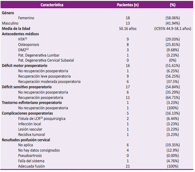 Cuando se analizó las complicaciones posoperatorias se consideró la presencia de infección de herida operatoria superficial o profunda, la presencia de fístula de líquido cefalorraquídeo (LCR) posquirúrgica, recidiva tumoral o lesión vascular. En los resultados imagenológicos posfusión cervical se valoró la pseudoartrosis, la falla del sistema (que incluye subsidencia de tornillos o ruptura de las barras) y la adecuada fusión.