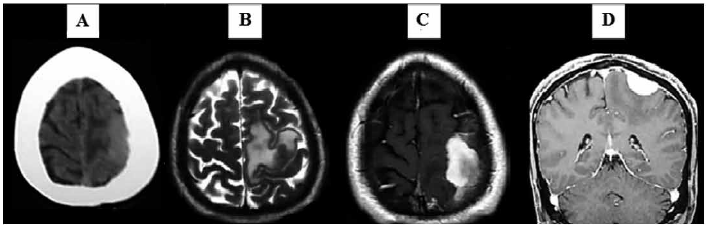 (A) Tomografía sin contraste corte axial: Lesión extra-axial, hiperdensa (en relación con parénquima cerebral) en región fronto-parietal izquierda, con edema asociado e hiperostosis en tabla interna craneal adyacente a lesión .(B) RMN T2 axial: Lesión a nivel fronto-parietal izquierda con edema asociado, nexo a giro precentral (en relación al “omega invertido” o área motora de la mano) y giro poscentral (área somatosensorial primaria) que no involucra la pared del seno sagital superior.(C) RMN T1C axial con contraste: Lesión captadora de contraste (gadolinio), bien delimitada, de bordes discretamente irregulares y de centro denso. (D) RMN T1C coronal con contraste: Lesión extra-axial con “cola dural” o “cola de ratón”, a ambos lados de su parte central. La captación de contraste por la lesión es homogénea. El edema vasogénico, que incrementa el efecto de masa, lateraliza el falx del cerebro.