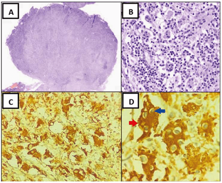 Hospital Cayetano Heredia: Corte histológico de la tumoración. (A) Tejido de apariencia fibrosa vagamente nodular con un fondo inflamatorio (H&E). (B) A mayor aumento se observa un infiltrado inflamatorio de linfocitos, células plasmáticas e histiocitos (H&E). (C) y (D) Inmunohistoquímica S100 resalta el citoplasma de los histiocitos (flecha roja) con células inflamatorias en su interior (flecha azul), evento biológico conocido como emperipolesis. No se observó proliferación meningotelial ni granulomas. Resultado inmunohistológico del Instituto Nacional de Enfermedades Neoplásicas (INEN) de Lima-Perú: macrófagos S100+, CD163+, CD68-/+ Y CD30-. CD38 revela células plasmáticas con relación IGG/IGG4 de 1/5. Tejido fibroso con proceso inflamatorio crónico e histiocitos con emperipolesis, sugestiva de Enfermedad de Rosai- Dorfman. No cambios neoplásicos.