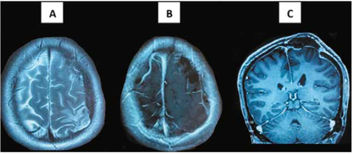 (A) T2 axial: área pequeña de encefalomalacia fronto-parietal izquierda, en relación con el área lesional antigua, con surcos cerebrales visibles. (B) T1C axial con contraste: no captación de contraste (gadolinio) en área donde se ubicó previamente la lesión. (C) T1C coronal con contraste: no captación de contraste a nivel fronto-parietal izquierdo; se evidencia ausencia de calota craneal en dicha área.